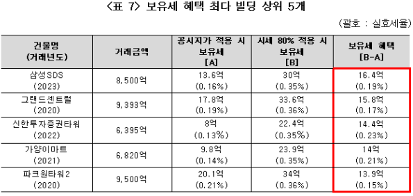 공시지가의 낮은 시세반영률 덕분에 어떤 빌딩이 가장 많은 보유세 혜택을 봤는지 계산했다. 삼성SDS 빌딩은 공시지가 적용 시 보유세를 13.6억 내야 했지만 시세 80% 적용 시 16억이 늘어난 30억을 보유세로 내야 하는 것으로 나타났다.