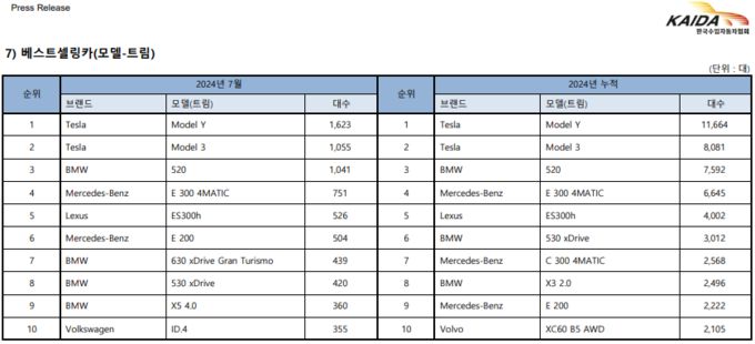 7월 베스트셀링 모델은 테슬라 Model Y(1,623대), 테슬라 Model 3(1,055대), 비엠더블유 520 (1,041대) 순