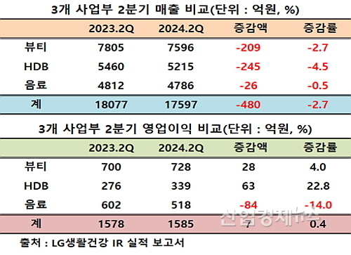 [산업경제뉴스 민혜정 기자] LG생활건강의 올 2분기 실적이 매출은 전년 동기대비 소폭 감소한 반면에 영업이익은 소폭 증가하는 혼조세를 보인 것으로 밝혀졌다.