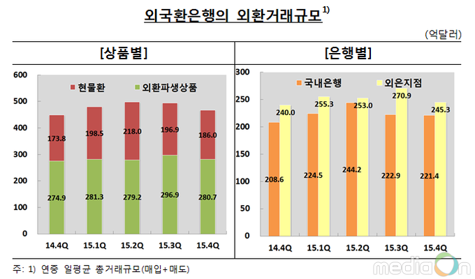 2015년중 외국환은행의 외환거래 규모는 지난 2008년(486.5억달러) 이후 최대수준이다.