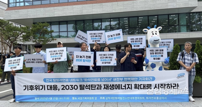 ![지난 6월 25일 오전, 서울 국정기획위원회 앞에서 열린 기후위기 대응 시민사회 기자회견에서 참가자들이 '2030 탈석탄'과 재생에너지 확대를 촉구하는 피켓을 들고 있다. [사진=화석연료를 넘어서(KBF)]](http://www.entropytimes.co.kr/data/photos/20250626/art_17509250524181_76f018.png)
