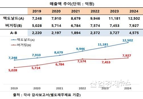이로써 양사의 매출 격차는 지난 2019년 2220억, 2020년 2197억, 2021년 1894억, 2022년 2372억, 2023년 3727억에 이어 지난해는 4575억 원으로 점점 벌어져 특단의 전기가 없을 경우 맥도날드의 외형을 따라잡는 것은 쉽지 않을 것이란 전망이 대세를 이루고 있다.