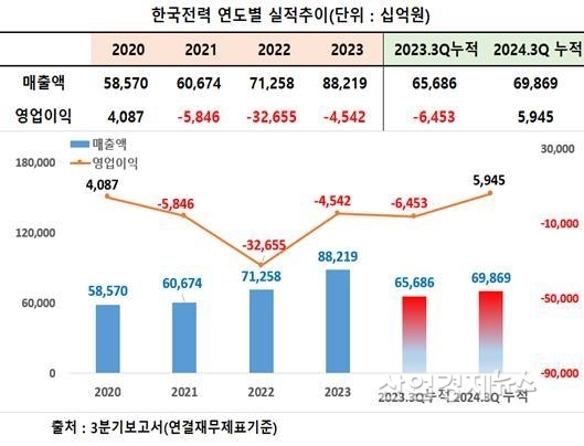 [산업경제뉴스 이상현 기자] 한국전력(이하 한전)의 올 3분기까지 누적 손익이 최근 3년간 내리 이어진 속절없는 적자행진을 마감하고 흑자로 반전된 것으로 밝혀졌다.