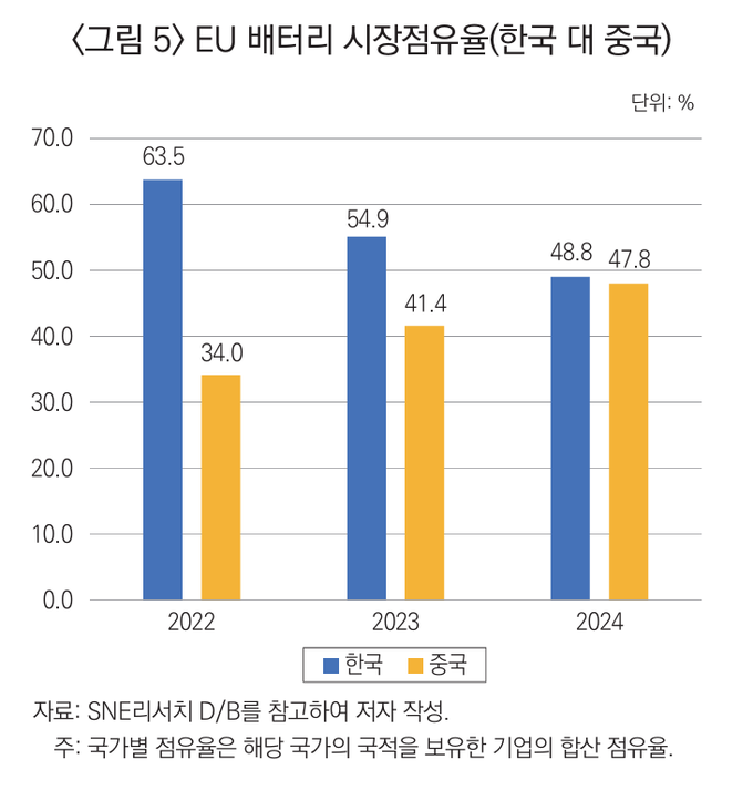 이러한 변화는 배터리 시장에도 직접적인 영향을 미쳤다. EU 시장에서 한국 배터리 기업의 점유율은 2022년 63.5%에서 2024년 48.8%로 하락했으며, 중국 기업은 같은 기간 34.0%에서 47.8%로 급등해 한국을 바짝 추격하고 있다.