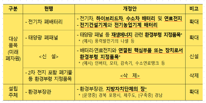 이번 개정안은 향후 급증할 것으로 예상되는 폐배터리, 폐패널 등 미래폐자원의 회수·보관·재활용 전 과정을 체계적으로 지원하고, 지자체 중심의 순환이용 산업 기반을 강화하는 데 초점을 맞췄다.