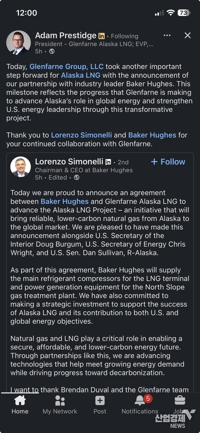 아담 프레스티지(Adam Prestidge) 글랜파른 알래스카 LNG 법인(LLC) 사장은 10일(현지시간) 자신의 링크드인(linkedin) 계정에서 “글렌파른은 오늘 업계 선두주자인 베이커 휴즈와 파트너십 체결을 발표하며, 이 혁신적 프로젝트를 통해 세계 에너지 시장에서 알래스카의 역할을 확대하고 미국의 에너지 리더십을 강화하기 위해 이룩해 온 진전을 보여줄 것”이라며 이 같이 밝혔다.