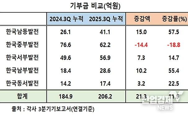 [산업경제뉴스 민경종 기자] 한국수력원자력(이하 한수원)을 제외한 한국전력의 발전 자회사(공기업) 5곳 중 한국중부발전이 나홀로 기부금을 줄인 것으로 나타나 눈총을 사고 있다. 특히 사업아이템이 완전히 다른 한수원을 제외하고 거의 동일한 사업구조를 가진 한국남동발전 등 4개사는 손익이 악화하는 와중에도 전년 대비 기부금을 모두 늘린 것으로 파악돼 중부발전의 경우와 대조적이다. 더욱이 국민의 세금으로 운영되는 공기업으로서 우리 사회의 약자들을 위한 기부금을 줄인 것은 공기업으로서 납득하기 어렵다는 지적이 나온다. 그렇다면 한국중부발전 등 5개사의 지난해 3분기까지 영업실적, 특히 손익과 기부금 총액이 어떠하였기에 이 같은 소리가 나오는 걸까? ■ 발전 공기업 5사, ‘SMP하락으로 합산 매출·영업익 모두 ‘뒷걸음’ 먼저 각사의 지난해 3분기 보고서에 의거해 누적 매출액과 영업이익, 기부금 수치를 살펴보면 매출은 5개사 공히 2024년 3분기와 비교해 쪼그라들었다. 5개사의 합산 누적매출액은 22조8848억 원으로, 전년 동기 25조8167억 원과 비교해 약 2조9319억 원이 줄어 11.4% 가량 역 성장했다. 5개사 모두 역 성장을 면치 못했는데, 중부발전은