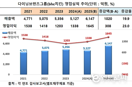 [엔트로피타임즈 민경종 기자] 치킨업계 외형 1위 bhc를 운영하는 다이닝브렌즈그룹이 지난해 창사 최대의 매출과 영업이익 시현은 물론, 업계 최초로 외형 6천억 고지에 등극하는 등 고공비행을 펼치고 있다.