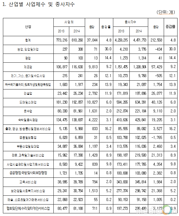 2013년 773,216개와 비교하면 전체 사업체 수는 37,044개(4.8%)가 증가했으며, 종사자 수 역시 2013년 4,259,215명에서 2014년 4,471,773명으로 212,558명(5.0%) 늘어 전국에서 가장 높은 증가세를 기록했다.