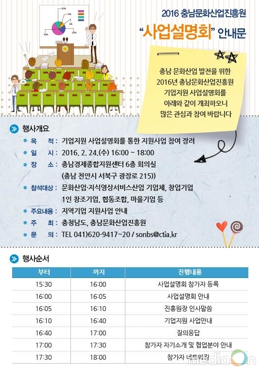 (미디어온) 충남문화산업진흥원은 충남도와 함께 ‘2016 충남문화산업진흥원 기업지원 사업설명회’를 오는 24일 오후 4시, 충남북부상공회의소 6층에서 개최한다고 밝혔다. 설명회와 함께 네트워킹 시간을 마련해 기업 애로사항 접수와 참가자들 간의 교류협력의 장을 제공한다고 밝혔다.