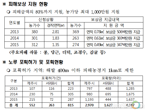 (미디어온) 제주특별자치도에서는 지난 2013년 7월 1일부터 오는 6월 30일까지 3년간 한시적으로 농작물피해지역에 서식하면서 농작물 피해를 주는 노루에 한해 포획을 하고 있고, 야생동물로 인한 농작물, 가축 등 피해에 대해 최소한의 농가 소득 보전을 위해 지난해부터 최대 1,000만 원 까지 피해보상 지원을 해주고 있다고 밝혔다.