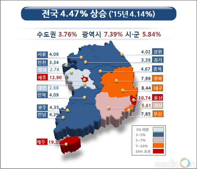 2016년도 표준지공시지가는 전년대비 전국 평균 4.47% 올라, 전년도 상승률 4.14%에 비해 상승 폭이 다소 증가한 것으로 나타났다.