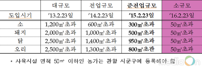 2016년 2월 23일부터는 축산업 허가대상이 가축사육업 소규모이상 농가까지 확대 시행되는데 소규모농가는 사육시설면적이 소·돼지·닭·오리 50㎡ 초과하는 농가가 해당된다.