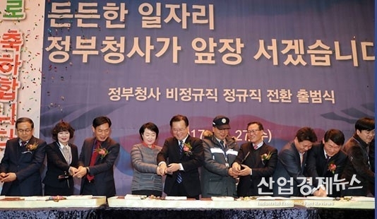 이와 관련 비정규직 용역근로자 2435명이 정규직으로 전환되는 정부청사관리본부는 27일 정부세종청사에서 정부청사 정규직 출범식을 실시하였다.