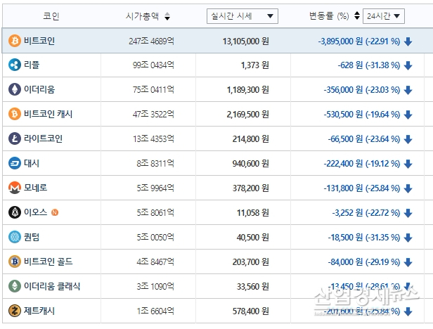 ■ 비트코인 28%↓, 퀀텀 33%↓, 리플 28%↓...연속 이틀 급락세