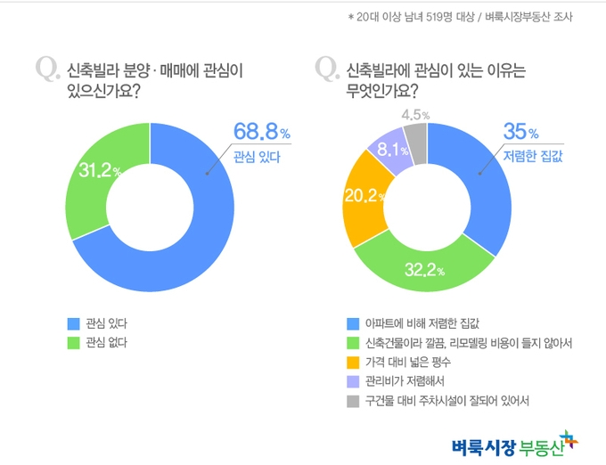 벼룩시장부동산이 이사를 계획중인 성인남녀 519명을 대상으로 설문을 진행한 결과, 68.8%가 아파트보다 신축빌라를 찾고 있는 것으로 조사됐다.