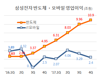[산업경제뉴스 문성희 기자] 삼성전자가 2018년을 '매출은 감소', '이익은 주춤'하는 모습으로 시작했다. 지난해 1분기 이후 꾸준한 상승세를 보였지만 1년 만에 매출이 하락세로 돌아 섰다. 반도체의 상승세에 더해 이번 1분기에는 스마트폰 신제품이 출시돼 실적 상승을 기대한 시장은 실망하는 표정이다.