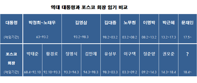 포스코는 설립후 50년 동안 8명의 회장이 수장을 맡았다. 1968년 설립후 1992년까지 박태준 회장이 무려 24년 동안 회장직을 수행했고 이후 26년 동안 7명의 회장이 역임했다. 1명이 평균 3.6년간 회장직을 수행했는데 이 기간과 시기는 역대 대통령의 임기 5년과 거의 대부분 맞물려 있다.