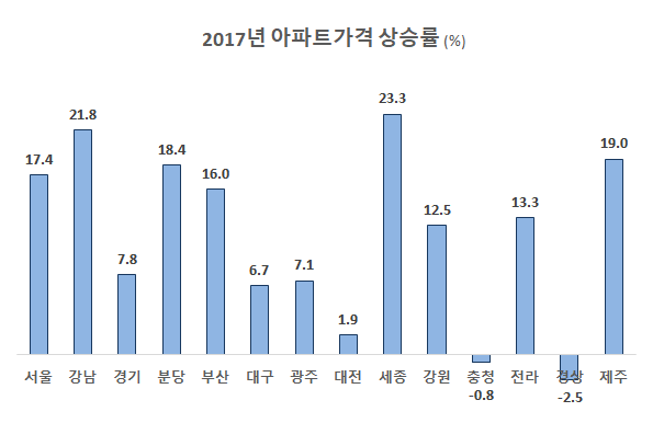 제주도도 지난해 연간 19.0%의 상승률을 기록하며 분당보다 높은 집값 상승세를 보였지만 올해는 -0.9%의 상승률을 보이며 오히려 아파트값이 하락했다.