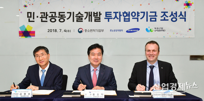 르노삼성은 4일 경기도 용인시 르노테크놀로지코리아(중앙연구소)에서 중소기업과의 공동기술개발 추진을 위해 중소벤처기업부(장관 홍종학)와 ‘3차 민관공동기술개발 투자협약기금’ 조성을 위한 협약을 체결했다고 밝혔다.