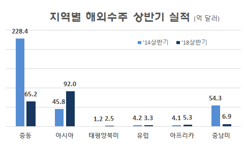 4년 전 아시아 지역의 상반기 수주액은 46억 달러에 그쳤지만, 올 상반기에는 92억 달러의 실적을 거둬 정확히 2 배 증가하며 중동을 제치고 1위로 올라섰다.