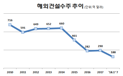 해외건설 수주액은 2010년 716억 달러까지 솟아 올랐고 이후 건설업계는 해마다 700억 달러를 넘기자는 구호를 외치며 외형확대에 몰입했다. 하지만 2014년 660억 달러를 기록한 이후 해외수주는 급감했고 2년 만에 반토막이 나버렸다. 그리고 올해까지 그 상태에 멈춰있다.