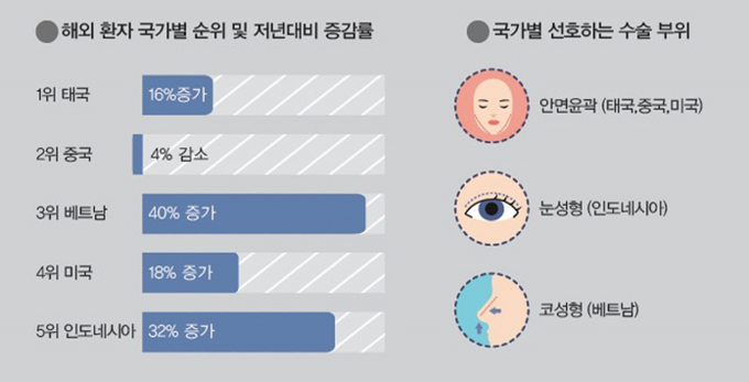 과거 중국인들의 성형관광이 가장 많았지만 올 상반기에는 태국이 16% 증가하면서 가장 많았고, 중국은 4% 감소하며 두 번째로 많았다.