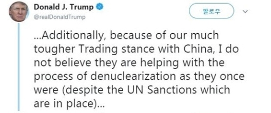 트럼프 대통령은 자신의 트위터에 미국과 중국의 무역 갈등때문에 중국이 비핵화 작업을 도와주지 않고 있다고 중국을 탓했다. 또, 중국과의 무역 협상이 해결된 이후에 폼페이오 장관이 북한을 방문할 것이라고 덧붙여 이번 품페이오 장관의 방북을 사실상 기한없이 연기했다.