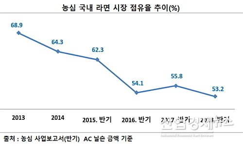 [산업경제뉴스 민혜정 기자] 국내 라면시장 절대강자 농심의 고민이 깊어지고 있다.