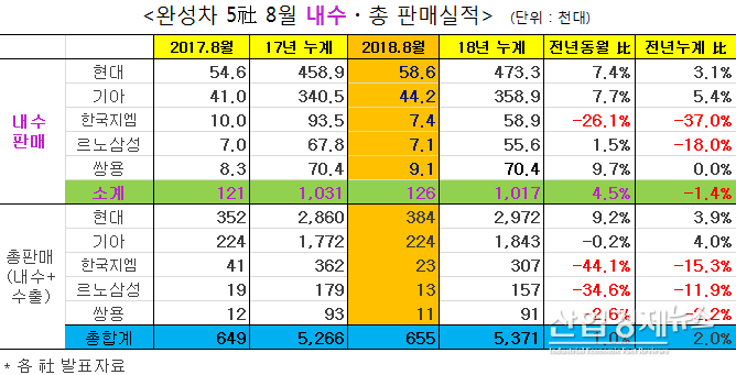 [산업경제뉴스 김소산 기자] 국내 완성차 5사(현대·기아자동차, 한국지엠, 르노삼성, 쌍용자동차)의 지난달 내수판매량은 7월 중순부터 시행된 개별소비세 인하 영향에 힘입어 지난해 같은 달 보다 4.5% 성장한 것으로 나타났다.