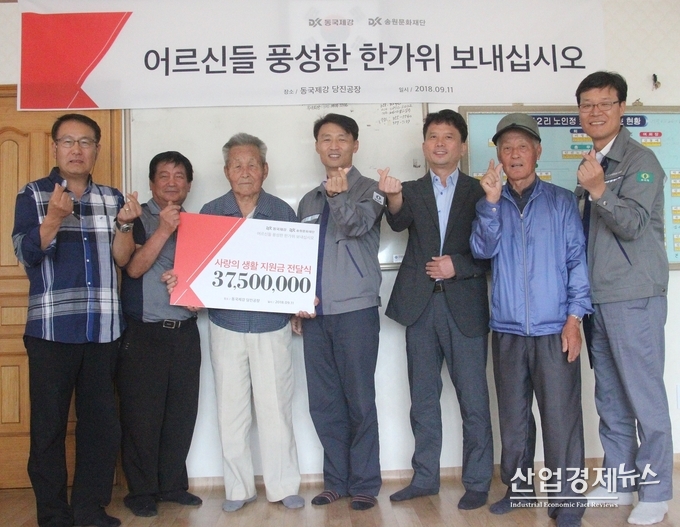 동국제강은 11일 추석을 앞두고 당진공장에서 공장장 김지탁 이사와 송원문화재단 박치안 사무국장이 참석한 가운데 송악읍 한진1,2리 지역주민 30명을 초청하여 식사를 함께하고 생활지원금과 명절 선물을 전달했다.