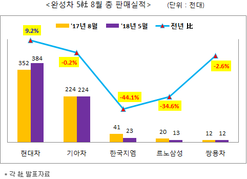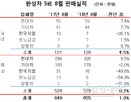 [산업경제뉴스 김소산 기자] 현대자동차, 기아자동차, 한국지엠, 르노삼성, 쌍용자동차로 대표되는 완성차 5사의 지난달 총 판매 증가율은 지난해 같은 달 보다 1.0%의 강보합세로 마감했다.