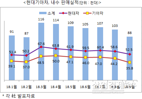 기아차는 최다 판매모델 카니발의 선전에도 불구 전년 동월 보다 4.2% 감소했고, 인기모델 k3이 지난달 2382대 판매에 그치며 3월달 5085대 판매량을 보인 이후 줄 곳 하락세 이어갔으며, 쏘렌토도 지난 3월 6965대에서 9월 3943대 판매에 그침에 따라, 내수에서 전년 동월 보다 25.4%가 줄면서 하락 추세를 이어갔다.
