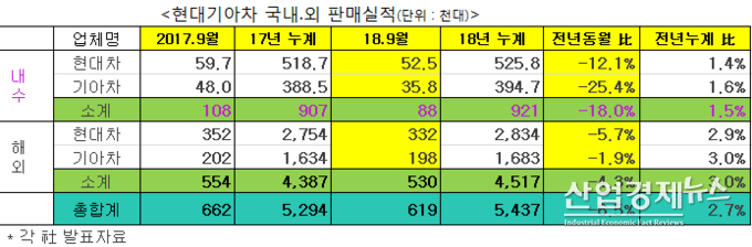 이로써 현대기아차 9월 합산실적은 전년 동월 대비로는 - 18%로, 이는 올해 들어 최고치를 기록했던 지난 3월 한 달 간 판매량과 비교해서는 24%(2만7823대↓)가 줄어든 실적이다.