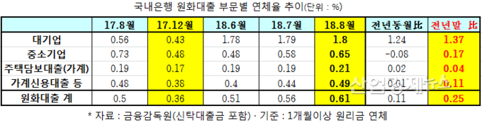 금융감독원 조사에 따르면, 지난 8월말 현재 국내은행 원화대출 연체율은 0.61%로 지난해 말과 직전 월인 7월 보다는 0.25%p, 0.05%p가 각각 증가해 올해 들어 가파른 상승세를 이어가고 있다.
