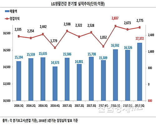 LG생활건강이 공시한 3분기 잠정실적(연결)에 따르면 내수경기 침체 지속과 사드 여파 지속 등 어려운 경영환경에서도 뷰티 럭셔리제품 중심 전략이 효과를 발휘, 창사 이래 역대 분기매출 최고치를 갱신하는 호 실적을 이뤄냈다.
