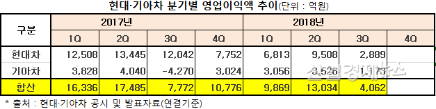 최근 현대기아차는 3분기 영업이익(연결기준)에서 현대차 2889억 원, 기아차 1173억 원의 실적을 발표했다.