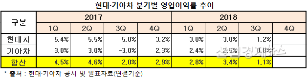 이러한 급락추세는 올해 들어서도 지속되고 있다. 현대차의 올 해 1/4분기 영업이익률은 또다시 3.0%로 하락한 이후 지난 3분기는 1.2% 까지 추락했고, 기아차도 같은 기간 2.4%에서 0.8%로 힘없이 주저앉았다. 두 회사 합산으로는 1.1%까지 곤두박질 쳐 끝모를 추락행진을 펼치고 있다.