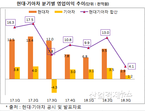 [산업경제뉴스 김소산 기자] 현대·기아자동차의 지난 3분기 영업이익이 4062억원에 그치며 두 회사의 합산 영업이익율이 1.1%까지 추락했다. 이는 약 1년전(지난해 2분기 1조7485억 원) 대비 1/4토막에도 못 미치는 실적으로 '날개 없는 추락' 행진을 지속하고 있다.