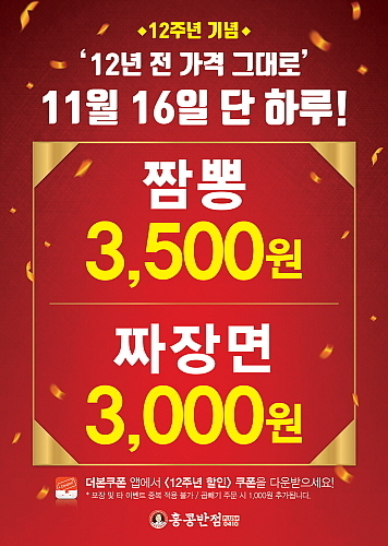 [산업경제뉴스 민혜정 기자] 더본코리아의 짬뽕·짜장면 전문점 홍콩반점0410(대표 백종원)이 개점 12주년을 기념, 11월 16일 단 하루, 브랜드의 대표메뉴인 짬뽕과 짜장면을 12년 전 가격 그대로 판매한다고 밝혔다.