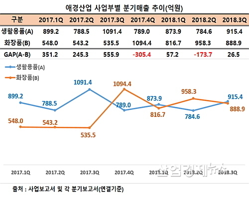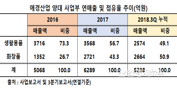 1985년 설립이후 압도적 매출 우위를 점했던 생활용품 사업부가 1991년 첫 사업을 개시한 화장품사업부에게 3분기 누적 기준 첫 역전을 허용했다. 지난 2016년까지만 해도 두 사업부의 매출 점유 비중이 ‘생활용품 73.3% vs 화장품 26.7%’에서 1년여 만에 49.1% vs 50.9%로 지위가 뒤바뀐 것.