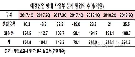 3분기 생활용품사업 손익 기여도, 화장품의 13.8% 수준...이미 2016년부터 뒤쳐져
