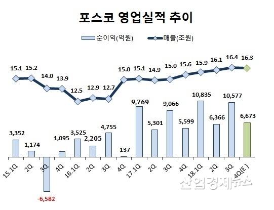 시장조사업체 에프엔가이드가 추정한 포스코의 지난해 연간 실적은, 매출 64조6800억원, 영업이익 5조6000억원, 당기순이익 3조4500억원 수준이다.