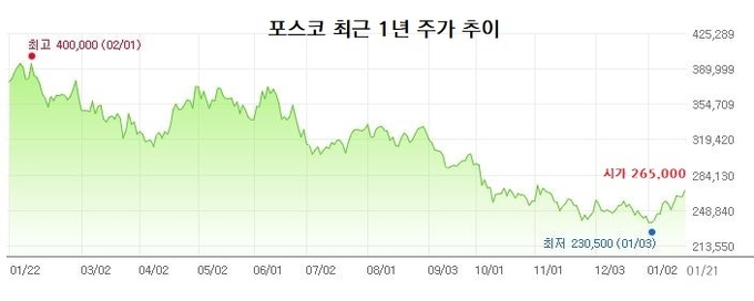 포스코의 주가는 지난 1년 사이 하락세를 면치 못하고 있다. 지난해 2월 40만원을 정점으로 이후 계속 하락해 올해 1월 초 23만원까지 떨어지며 43% 하락폭을 보였다. 최근 몇일 반등해 26만원대로 오르기도 했지만 최고점과 비교하면 여전히 30% 이상 빠진 금액이다.