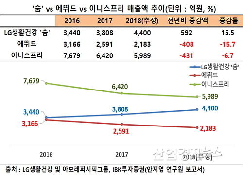 LG생활건강과 아모레퍼시픽그룹, IBK투자증권 안지영 연구원 보고서에 의거, 숨의 지난 2016년 이후 지난해까지 3년간 매출 추이를 이니스프리와 에뛰드 실적과 비교해 보면 정반대의 사이클을 그리고 있다.