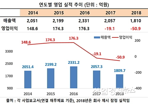 특히 손익은 매출보다 더 참담해, 지난해 50.9억 원의 영업 손실을 시현, 전년도 19.1억 보다 적자가 더욱 확대됐다. 이는 2016년에 기록했던 176.3억의 영업이익과 비교하면 불과 2년 사이 무려 227.2억 원이나 급감한 수치다.