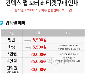 모터쇼 기간 총 열흘 간 자유롭게 관람할 수 있는 전일관람권 가격은 3만원이다. 옥션티켓을 통해 구매한 입장권은 옥션 앱 또는 현장 매표소에서 입장권으로 교환해 전시장으로 입장할 수 있다.