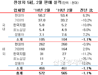 [산업경제뉴스 김소산 기자] [산업경제뉴스 김소산 기자] 현대자동차, 기아자동차, 한국지엠, 르노삼성자동차, 쌍용자동차로 대표되는 국내 완성차 5사의 판매부진이 1월에 이어 2월에도 지속되고 있다.