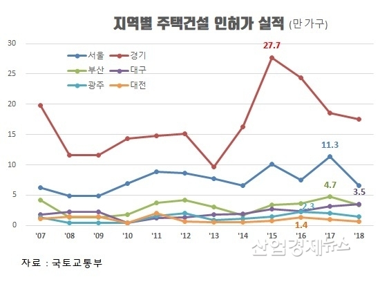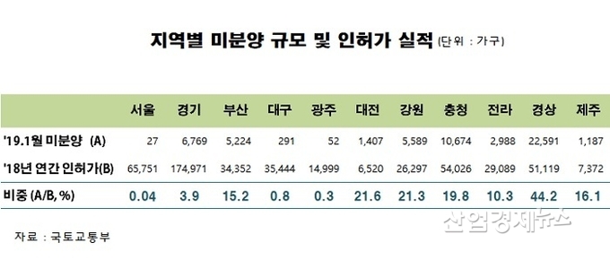 산업경제뉴스가 지난 1월의 미분양 재고와 2018년 인허가 물량을 비교해 본 결과, 서울의 경우 사실상 공급된 물량 거의 대부분이 분양되고 있는 것으로 분석된다. 하지만, 대전, 강원, 충청, 부산 등은 연간 공급물량의 20% 수준에 달하는 미분양 재고가 쌓여 있는 것으로 파악됐다.