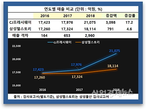 여기서 눈에 띄는 부분은 지난해 이들 회사의 매출 증가율(CJ 17.2%, 삼성 4.6%)격차가 무려 4배 넘게 벌어져, 거의 동일한 영업환경에도 불구하고 이토록 현격한 차이를 드러낸 점이다.